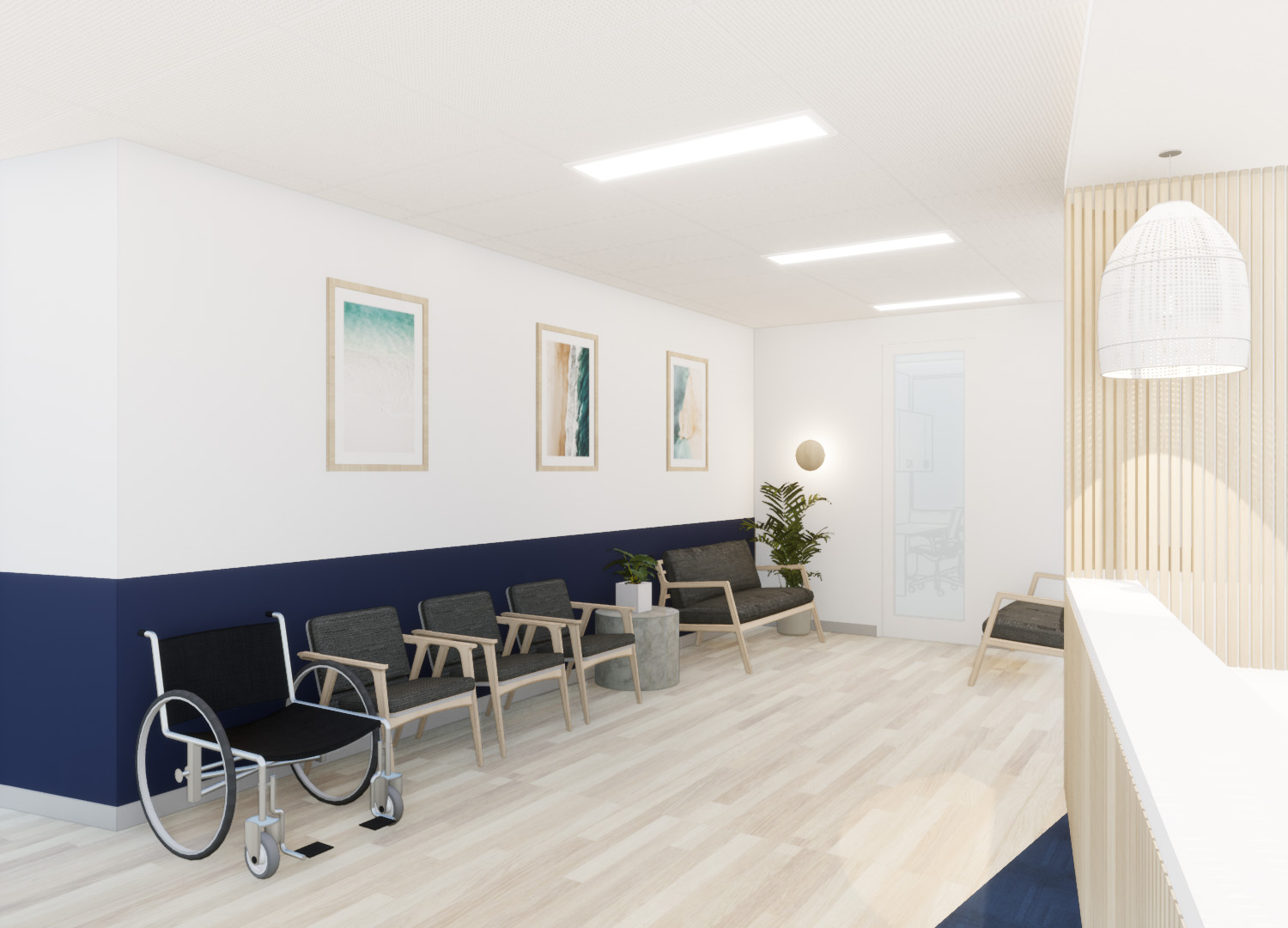 Upon entrance, visitors are welcomed with calming, coastal artwork and greenery. The reception desk features soft curves through its fixtures and finishes including rounded carpet inserts, LED lit bulkhead and rounded Tasmanian Oak battens to reception.