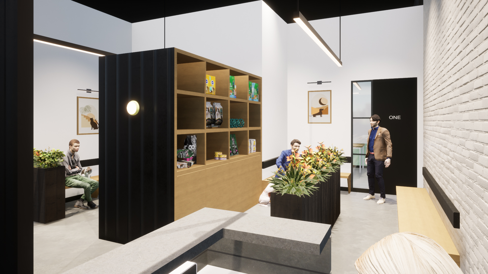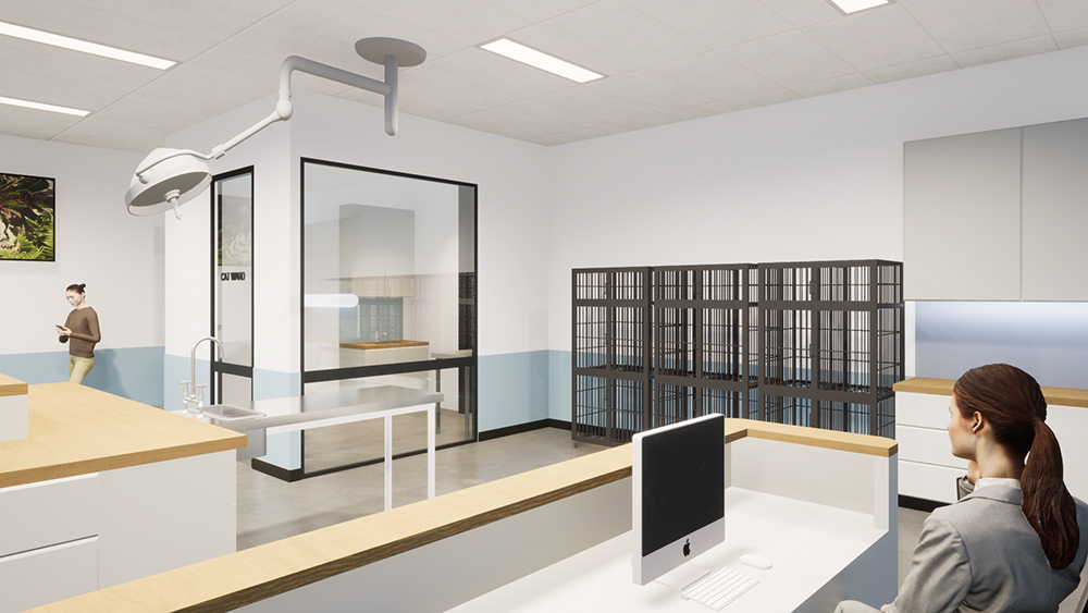 The space captures the following areas: spacious reception and waiting with separate dog and cat waiting, Exam consults rooms, dental exam, pharmacy and lab.